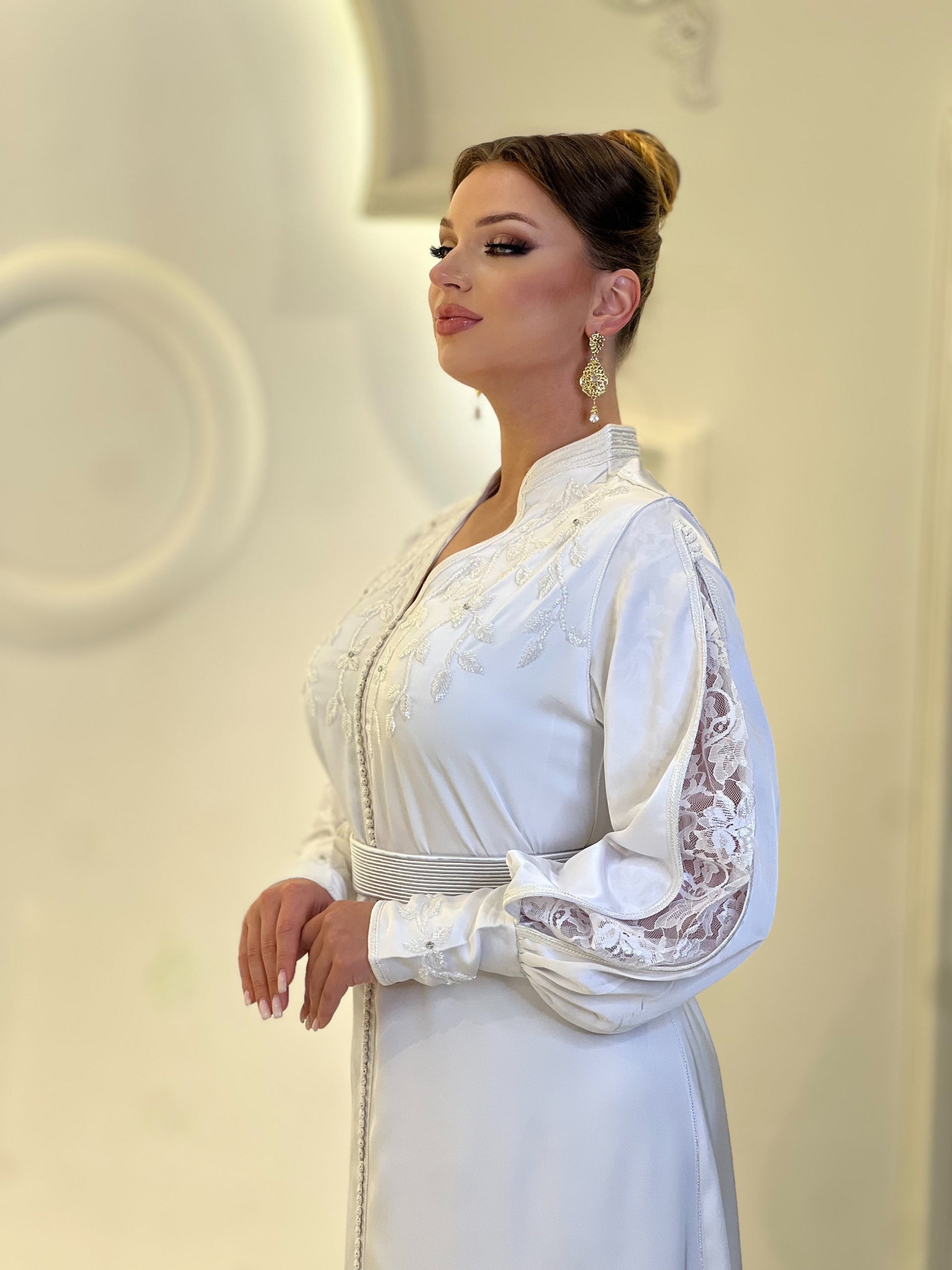 Experience the charm of timeless fashion with this dazzling white kaftan, perfect for making your special moments unforgettable.